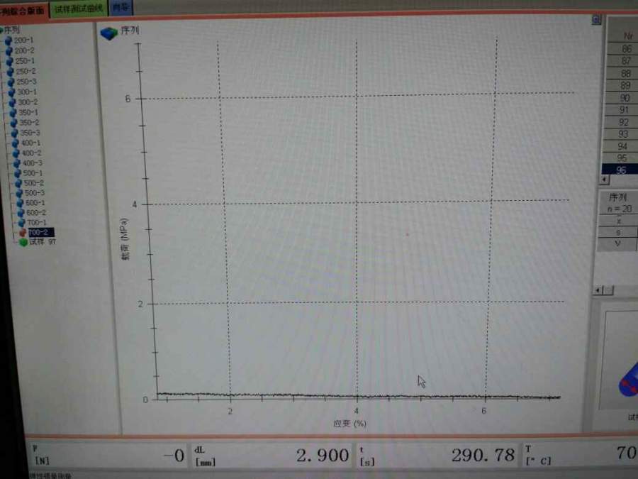 都会出现这种情况,做到700℃的时候,由于温度高,万能实验机上显示的力几乎到零了,根本无法拉断,但是实验可以一直进行下去,样品也确实拉长了,我只能手动结束测试。请问这是因为这种材料只能做到这个温度,还是因为其他原因(比如改变实验参数) 发自小木虫Android客户端 |