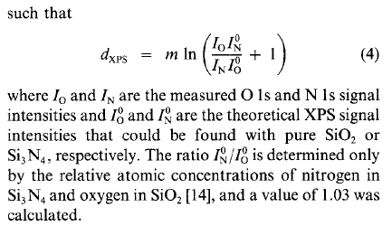 PETER GREIL 在 Oxygen distribution in silicon nitride powders中介绍了一种,利用XPS结果计算氮化硅表面氧化层厚度的方法,但我一直看不明白,不知道是怎么算的,还望有大神出来指教一下。 公式截图和论文都在附件。 1.PNG |