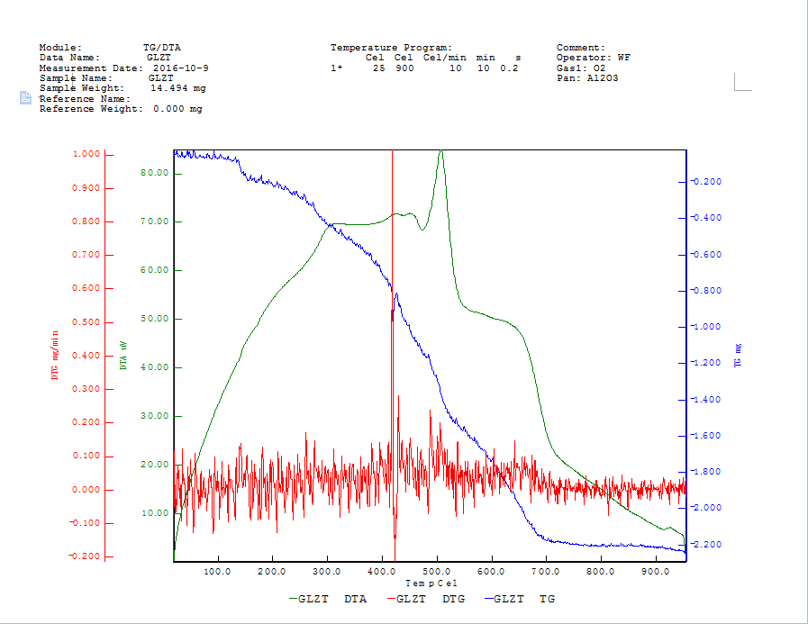 从差热分析(DTA)和热重(TG)看出,一开始粉末样就放热伴随质量减少,估计有机物燃烧了,300度左右可能是导电剂燃烧,420度可能是粘结剂的燃烧。300度左右活性物质开始发生反应,500最剧烈,700度分解基本完成。分析不一定正确,最好是把活性物分离出单个做热分析,在空气中做。