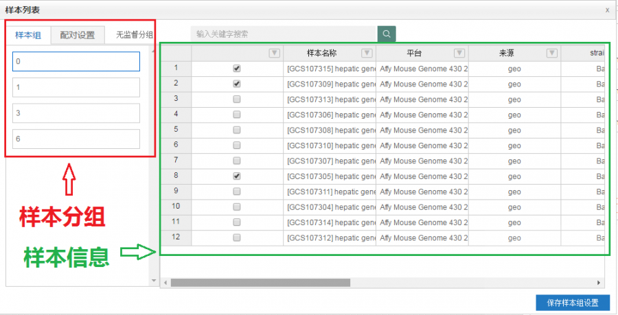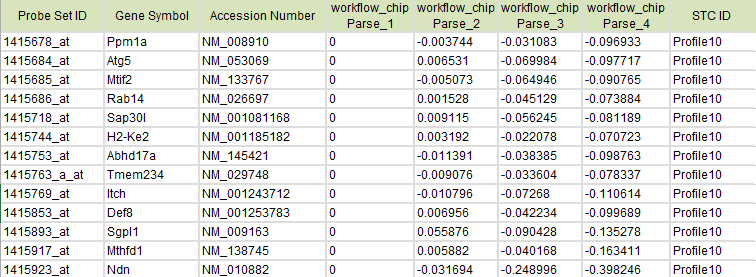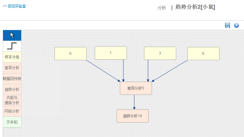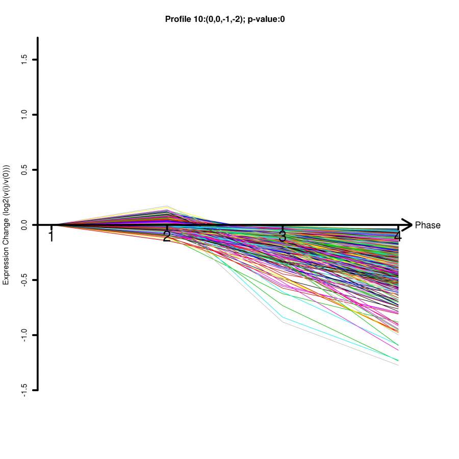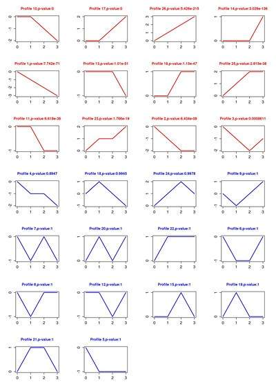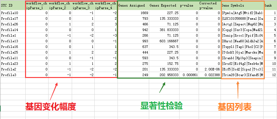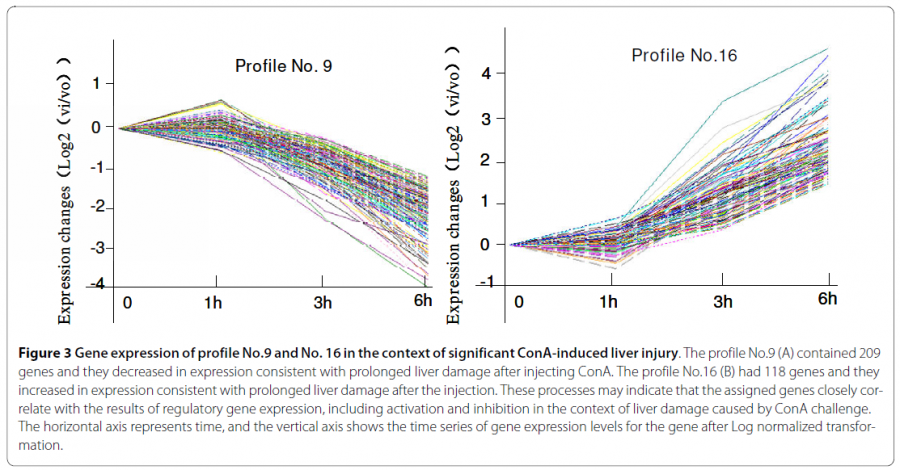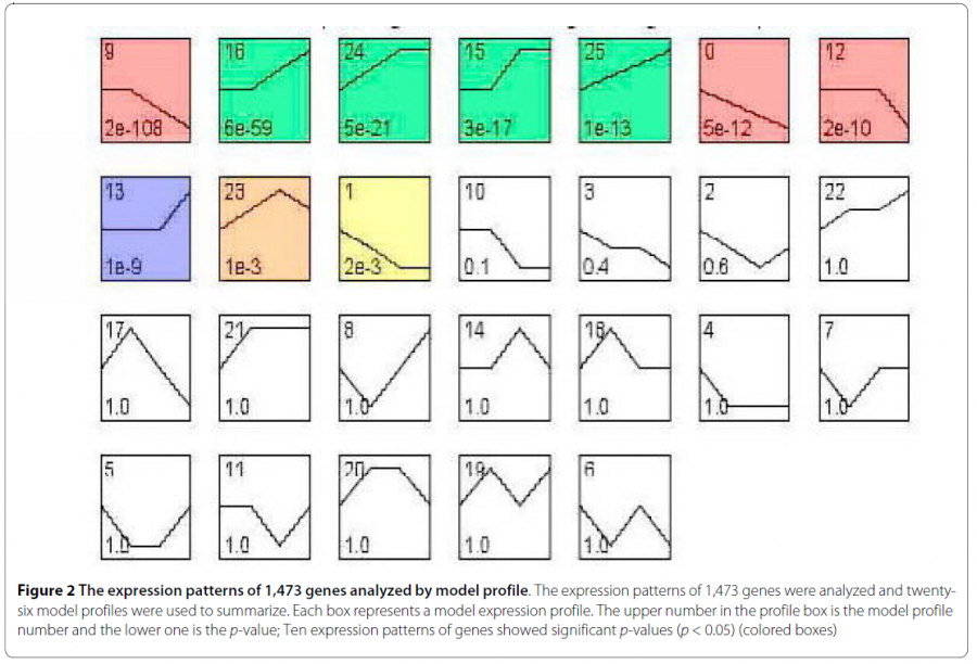 在实验的设计中,我们经常需要了解基因随时间,温度,药物浓度等变化的表达趋势。当生物体按照一定顺序发生变化或者受到外界环境刺激(如受到不同浓度的化学药物诱导)时,基因表达变化也会呈现趋势特征。 趋势分析 趋势分析(STC, Series Test of Cluster)就是发现基因表达的趋势特征,将相同变化特征的基因集中在一种变化趋势中,从而找到实验变化过程中最具有代表性的基因群,揭示生物样本在变化过程中所特有的规律。 应用场景举例 观察基因随时间的变化是趋势性分析应用较多的场景,下面我们就以此来看看趋势性分析的具体应用。 文章案例 Genes related to the very early stage of ConA-induced fulminant hepatitis: a gene-chip-based study in a mouse model 相关基因:ACSL1、MPDZ 相关疾病:Liver Failure 样本编号:GSE17184 PMID: 20398290 IF:3.867 这篇文章主要研究爆发性肝炎在早期阶段的病理机制,研究目的在于寻找病变过程中起主导作用的基因群及关键基因。作者采用ConA 诱导的小鼠肝炎模型,选取了0h,1h,3h,6h四个时间点做表达谱分析,用ANOVA筛选得到了1473个差异表达基因(p<0.05,FDR<0.05)。 为进一步筛选出显著变化的基因群,作者用趋势分析将差异基因的表达趋势进行了分门别类,从中得到了10个显著变化的趋势模型(p<0.05)。 图1 小鼠肝炎随时间变化的26个趋势模型,有颜色的代表显著的趋势模型(p<0.05),无颜色的代表不显著,相同颜色代表相似性的表达趋势 并在最显著变化的NO.9和NO.16趋势模型中,用基因共表达网络分析得到了26个核心基因,这些核心基因主要作用于蛋白转运、转录调节、细胞代谢方面。筛选出的核心基因为爆发性肝癌的早期诊断提供了分子依据。 图2 NO.9和NO.16趋势模型中基因的表达情况 趋势分析结果解析 上文作者在做爆发性肝癌的病理机制的研究中,通过趋势性分析来寻找病变过程中起主导作用的基因群。 那上述的趋势模型图具体怎么看呢? 完整的趋势分析结果是怎么的呢? 小编用上述文献中的样本GSE17184在GCBI在线实验室进行趋势分析,具体方案如下,0,1,3,6为时间分组,先对数据进行差异分析(P值<0.01 Q值<0.05),得到了9409个差异基因,再对差异基因进行趋势性分析。 图3 趋势分析方案图(数据GSE17184) 趋势模型总图 趋势分析得到的26个趋势模型(亦称为profile)中,筛选得到12个显著性profile(红色部分),最显著的两个分别为profile10和profile17,profile10和17都在1时无明显变化,随后开始下调/上调。 图4 GSE17184趋势模型总图 四个时间点为何是26种趋势模型? 如何将表达基因匹配到趋势模型中? 又如何判断趋势模型的显著性? 请戳方法论 如何看表达趋势模型呢?选取profile10作为示例。 图5 趋势总图中profile 10 图的正上方,显示趋势模型编号及P值。横坐标表示样本顺序,0、1、2、3分别对应时间点0h,1h,3h,6h。 纵坐标表示基因表达变化幅度,正负号表示上下调。 Profile 10的趋势模型可归纳为(0,0,-1,-2)。 (为什么趋势线都是都从0点开始呢?见下文)。 单个趋势图 趋势总图中的每个profile都对应有各自基因的趋势图。profile10的基因趋势图如下图所示。 图6 单个趋势模型 图的上方(0,0,-1,-2)对应趋势总图中的趋势模型。横坐标表示时间相,纵坐标表示表达变化幅度 log2(V(i)/V(0)),V(i)表示某相的表达值,V(0)表示0点的表达值。这就是为什么趋势线都是从零开始的。每条折线代表样本中的一个基因。 STC分析结果的详细信息可参见表格。 趋势模型总表 趋势总表中罗列了所有显著性趋势模型,红框中的参数表示基因在每个点变化幅度,绿框中为统计检验参数。 图7 趋势模型总表 genes assigned表示在每个趋势模型中的基因个数,gene expected表示置换基因样本顺序分配在这个趋势模型中的基因个数,由此来检验某个趋势模型是否具有统计显著性意义。黄框里是每个趋势模型的基因列表。 单个趋势模型列表 单个趋势模型列表罗列了每个profile中基因在每个时刻点的具体数值。 图8 单个趋势模型列表 STC-GO 在趋势分析中,可通过STC-GO进一步对显著趋势模型中的基因做GO功能分析,看基因群主要集中在哪些功能通路。上图profile10中的基因GO功能分析如下图所示,富集度最高的两个GO功能通路分别是细胞内铜离子转运和钙依赖的细胞基质黏附。 图9 profile 10 GO富集图 趋势分析方法 是否可以自行做趋势分析呢? 俗话说自己动手丰衣足食嘛。 在GCBI在线实验室,零基础照样做分析,只需拖动趋势分析模板即可。还是以上文中的数据GSE17184作为示范案例。 步骤 1、 进入GCBI网站的在线实验室 https://www.gcbi.com.cn(注册即可免费使用) 2、 建立趋势分析方案 建立了如下趋势分析方案。 图10 方案图 3、 选择样本数据。 在GCBI样本库中直接搜索GSE17184或直接搜文献也可获得数据链接,将数据发送至实验室以供后续分析。 图11 样本搜索 根据样本信息在每个时间点选择对应的实验样本。 图12 样本选择 4、 设置各模块参数 差异分析 P值<0.05 Q值<0.05(因多分组,不考虑fold change) 趋势分析 p值<0.05 显著性趋势功能分析(STC-GO) 分析类型:生物过程 p值<0.01,FDR<0.01 5、运行方案 运行几分钟即可得到结果。 就是这么简单明了,趋势分析,拿下了么? 拓展 检测工具 Clariom™ D assays, mouse(曾用名GeneChip® Mouse Transcriptome Assay 1.0) 拓展知识: 三点搞定GEO数据上传 差异基因结果解读 GO和pathway分析及结果解读 视频教程 手把手教你用GSEA做富集图 如何用path-net挑选核