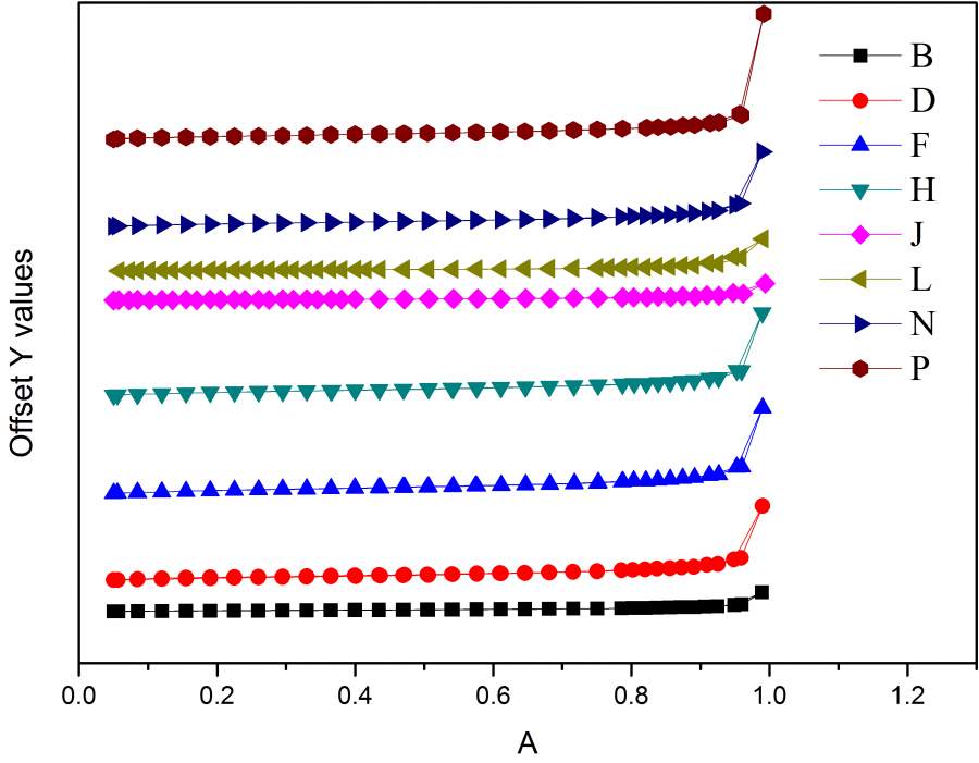 我想请问一下大家:BET的等温吸脱附曲线作图的时候数据可以归一化吗?因为我图中有八组数据,不归一化的话看着比较乱,如下图所示。另外,通过BET吸附脱附曲线能反应什么信息?我只能看出是第几种类型的曲线。谢谢! 归一化.jpg 不归一化.jpg |