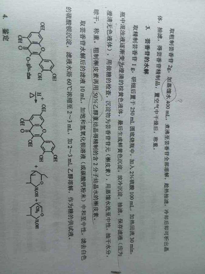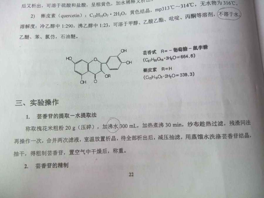 这是我们中药化学的实验,看了之后有点费解,主要是图二用铅笔画圈圈的地方: 1.芸香苷用水提取法,但为什么精制芸香苷的时候也是加蒸馏水,煮沸至芸香苷全部溶解呢? 我的思路是:精制就是去杂质,如果杂质能溶于水,那么第一步水提取法的时候不也就把杂质去了吗?精制加蒸馏水不是多此一举吗? 2.为什么用50%的乙醇重结晶得2分子结晶水的槲皮素?乙醇的浓度和几分子结晶水有关系的吗? 换句话说,假如我想重结晶得3分子水的槲皮素怎么办?还是另外用其他方法? 发自小木虫Android客户端 |
