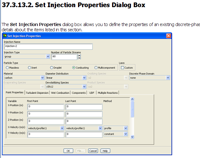fluent帮助文档中设置的这个injection中 X-Velocity(m/s)这项怎么才能像图中选择velocity(profile1)这个选项。我编的速度profile udf 已经读进去了,在边界条件中可以选择我的udf,但是在这里就没有选项,只用个constant。求指导! Image 1.png |