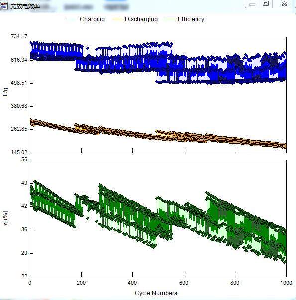 最近做一个材料,测了充放电循环实验,一个困惑问题。根据格式计算比电容只有200多,而充放电测试曲线上有600多,哪个准确啊?例外,测试曲线上的600比电容这个数值从哪里数据可以获取到? 用CS301仪器测试 Cache_51bd67ab877982af..jpg |
