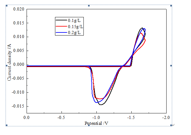 求助各位大神,本人用玻碳电极作为工作电极、铂电极作为辅助电极、饱和甘汞电极作为参比电极,在辰华电化学工作站上做氨性体系电沉积锌的循环伏安测试,为什么扫描出来的曲线的电流低于0就开始沉积了?如图所示,求解啊,是不是我哪里做错了