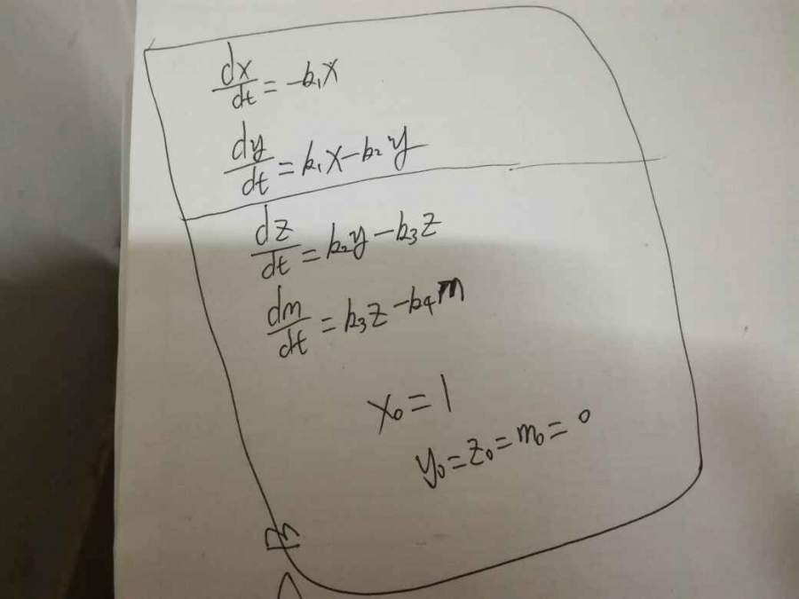 我仔细看了下我给你的代码回复,有一个地方要注意,就是解的顺序。 也就是dsolve得到的4个解的顺序,matlab可能是按m,x,y,z这样排列的。所以正确的解应该是: m=(k1*k2*k3*exp(-k2*t))/((k1 - k2)*(k2 - k3)*(k2 - k4)) - (k1*k2*k3*exp(-k1*t))/((k1 - k2)*(k1 - k3)*(k1 - k4)) - (k1*k2*k3*exp(-k3*t))/((k1 - k3)*(k2 - k3)*(k3 - k4)) + (k1*k2*k3*exp(-k4*t))/((k1 - k4)*(k2 - k4)*(k3 - k4)) x=exp(-k1*t) y=(k1*exp(-k2*t))/(k1 - k2) - (k1*exp(-k1*t))/(k1 - k2) z=(k1*k2*exp(-k1*t))/((k1 - k2)*(k1 - k3)) - (k1*k2*exp(-k2*t))/((k1 - k2)*(k2 - k3)) + (k1*k2*exp(-k3*t))/((k1 - k3)*(k2 - k3)) |