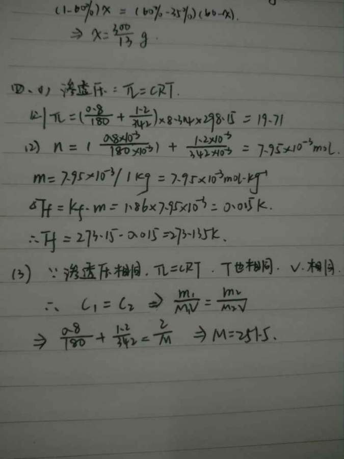 在25℃时,将2g某化合物溶于1Kg水中的渗透压与同温下将0.8g葡萄糖(C6H12O6)和1.2g蔗糖溶(C12H22O11)于1Kg水中的渗透压相等 ,已知水的冰点下降常数为1.86,25℃水的饱和蒸汽压为3167.7Pa。稀溶液的密度可取103Kg.m-3,该化合物中碳的质量分数为0.667,氢的质量分数为0.0794,氧的质量分数为0.2542。 求溶液渗透压 溶液冰点 化合物的分子量 发自小木虫Android客户端 |