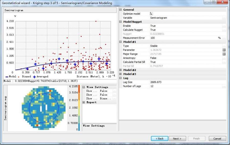 如图所示,我们想知道可以从该图中得到哪些信息。已知Paratial Sill是偏基台值,Sill是基台值,Nuggest是块金值,Range是变程。那么1. 拟合度怎么得到?2.横坐标是什么意思?有人说是有效滞后距,不懂。为什么是10-4? 半变异函数拟合分析.jpg |