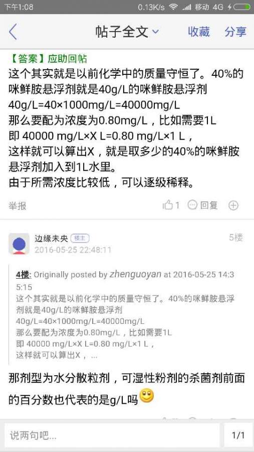 感谢解惑,以前也在小木虫问过这样的问题,然后得到了这样的回复,我一直理解成25%就是25000mg/L,看来一直的理解都错了,那么杀菌剂的稀释问题可以按照图片里的公式计算么 发自小木虫Android客户端 |