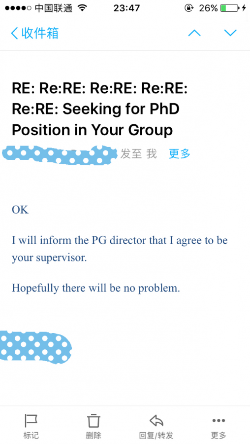 最近在申请港科大,有两个问题想问一问有经验的前辈。下面是我和他的邮件对话。 我说:“我想申请你的phd” 导师说:“我对你感兴趣,申请这个学校吧,选我作为你的导师,提交完申请之后通知我一声。” 我说:“我提交申请了。但是我在申请过程中没找到能填写导师姓名的栏目。 顺便请问我通过评审的概率是多少?” 他说:“ OK I will inform the PG director that I agree to be your supervisor. Hopefully there will be no problem. ” 我想请教大家一下,他这最后一句话到底是“我也不知道啊,希望没问题吧!”还是“放心吧,很有希望没问题!” 还有一个问题,我一直没问他关于奖学金的事情,听说香港的学校只要能入学就有奖学金?还是怎么回事?我对香港的奖学金不太清楚,希望有前辈来告知一下,万分感谢!!! 发自小木虫IOS客户端 |