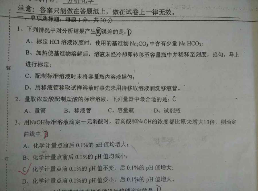 记住——误差的正负号都是对期望的结果而定的。 A,基准物含NaHCO3,单位质量NaHCO3 消耗的HCL 比 Na2CO3 少, 导致HCL 消耗降低,误判结果偏高。 + B,体积膨胀,实际浓度升高(20℃? 下),若取一定量,则消耗待标定物体积升高,误判浓度下降,-。 实际选项中使用的是立即标定,若全部转移后标定,则物质的量不变。无误差。 C,此选项有些模糊,一般而言溶液的分层是上部浓度较低。若取上部作为标准溶液,则会导致样品结果偏高。+ D, 移取的量不足,样品消耗降低,“含量”下降, - |