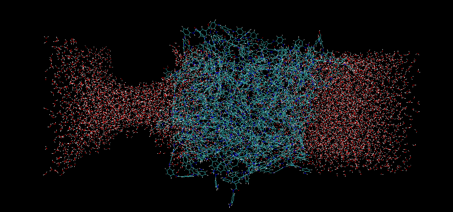 我在一个聚合物两侧加两个方形的水盒子,让它跑平衡,用的NPT,加了周期边界条件,跑完过后发现一侧的水盒子变形了,如图所示。想像中的应该还是保持方形的,不知道怎么回事? 请各位大神指点,谢谢了!! waterbox.png |