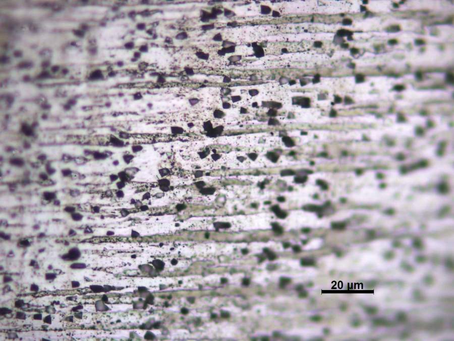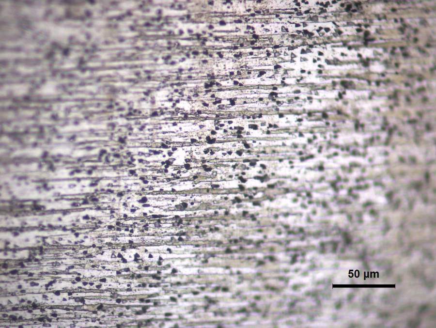 本人对微量元素Zr、Ti、Sc添加的7系铝合金轧板进行二级固溶处理,接着120℃/24h时效后轧向侧面的金相组织如图所示。想向有经验的人士请教一下,这里的大量分布的黑色质点是第二相么?为啥这么粗,是过烧组织了么? Al-60s-200.JPG Al-60s-500.JPG Al-60s-1000.JPG |