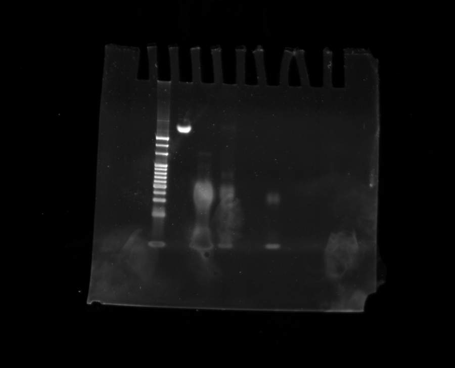 生物小白,请教各位大神~ 最近在做抗体与DNA通过化学键连接的实验,但不知道连接上了没有,用PAGE胶也跑不出来Ab-DNA的条带(图中从左到右分别是ladder,Ab,DNA,Ab-DNA, 后面浓度太稀看不出来可以不用管)。问了一下生物公司,说是不能用PAGE胶跑DNA和蛋白结合的产物。请问有什么好的方法证明二者连接上了吗? 拜谢拜谢~ 答得详细的可以追加金币哦 4.jpg |