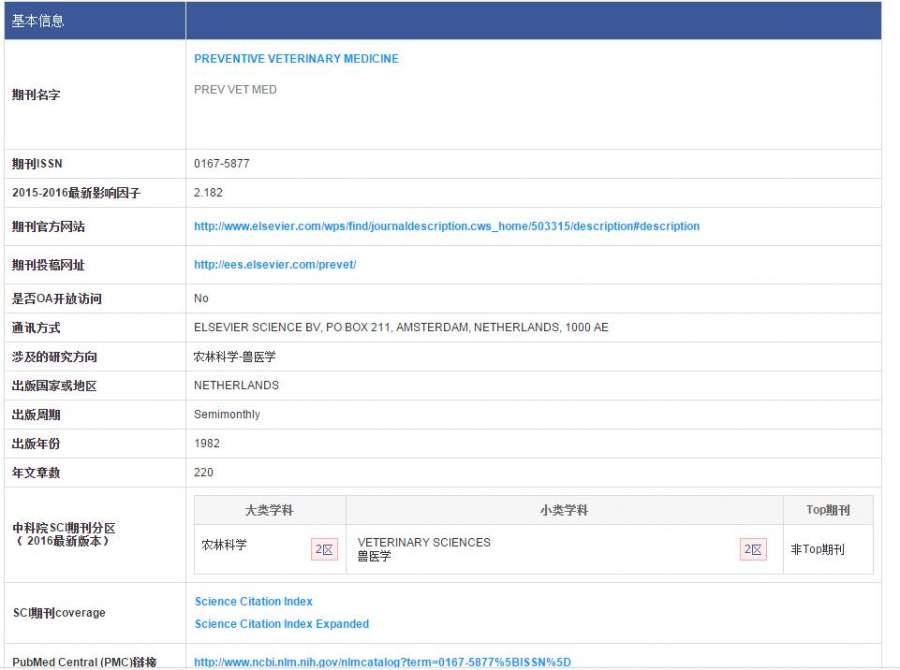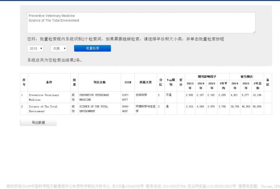 请有权限的同学帮忙查下这两个杂志的分区情况(大区、小区、是否Top),因为我要打印出来作为证明材料,所以要求附上截图(全屏幕),谢谢! 1. Preventive Veterinary Medicine; 2. Science of The Total Environment。 |