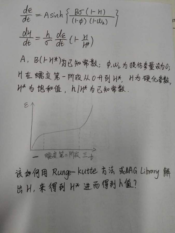 各位大神好,本人是研究钢材蠕变方向的,在拟合模型的过程中遇到了问题,求大神们指教,图片中是Dyson模型,在求h和H*的时候不知道该怎么求,如果用Matlab求该如何编写代码呢? qiujiao.jpg |
