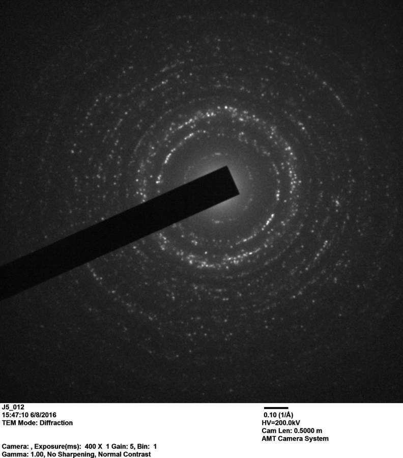 求助大神帮我看看这个图怎么算出比较明显衍射环对应的面间距。TEM软件不会量图中的距离。跪求学长帮忙啊!不知道圆环半径怎么量取,量取后是直接带人d=L x 入 / R 其中L= 0.5 m 入= 0.00254 nm 标尺代表的是 0.1 1/A 还是我看到别人上面的10 1/A 或是 10 1/nm ? J5_012.JPG |