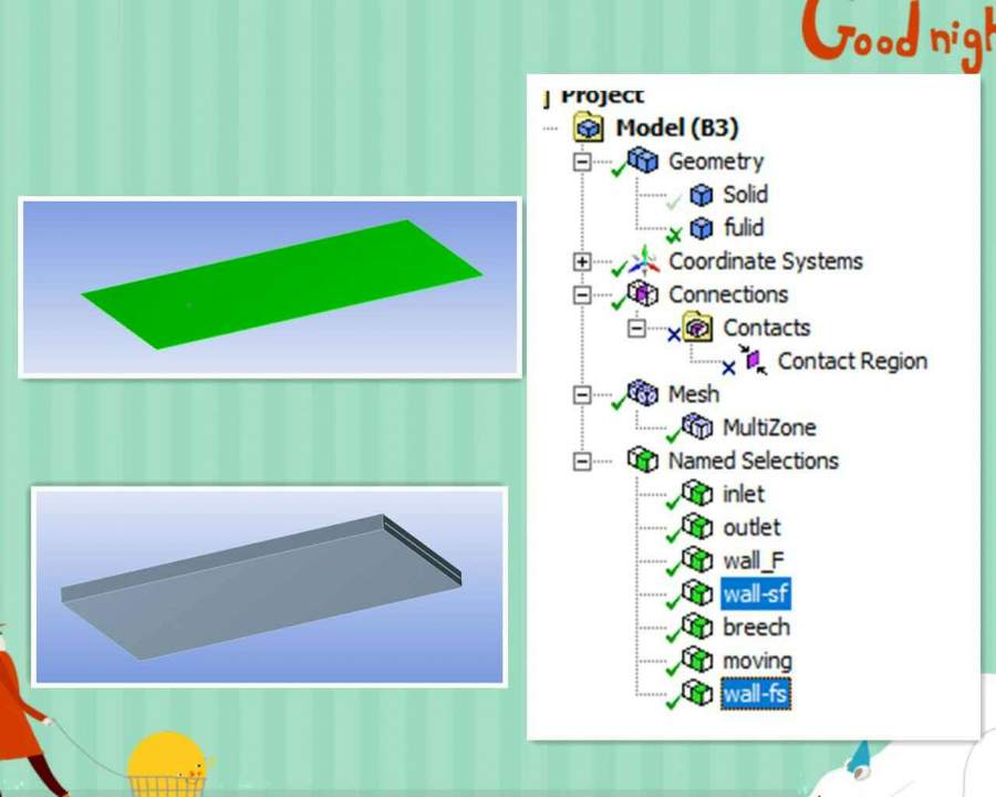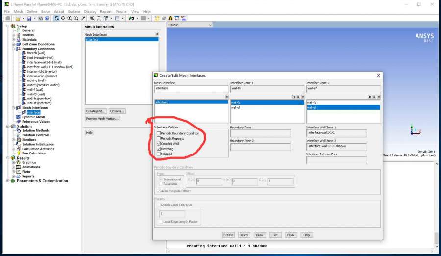 各位大神,我想做一个单向流固热耦合模拟,需要用到动网格的一些知识。模型如下图所示,图1的薄板一端固定,另一段不断延伸,在图1所示的冷却箱内冷却。划分网格使用的是MESH。划分网格时,取消了流体和固体交界面的自动连接,并对流体和固体上的交界面分别进行了命名,如图1所示。在导入FLUENT以后,进行面对接,请问,如图2所示的红圈中,应该选哪些选项?按图2所示的选项设置后,在边界条件设置一栏中多出了两个边界,如图3红线所示,请问多出来的wall是什么鬼,如果开启能量方程是不是只要设置成耦合就可以了? 发自小木虫Android客户端 |