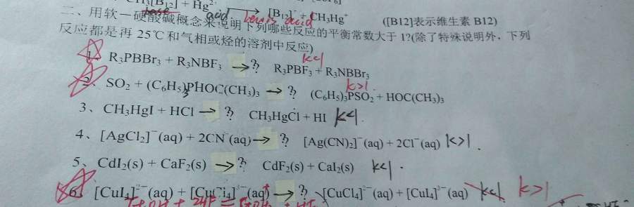 考察的很全面,首先你要知道:得他G小于0,反应向右进行,Kc大于1,反之亦然;然后软硬酸碱就是把半径接近的结合到一起,第一个里,P比N半径大,Br比F半径大,第二个,与O相比,S与P半径更接近,最后一个,Cu+比Cu2+半径大,I比Cl半径大,应用上面说的,判断反应方向就可以了 发自小木虫Android客户端 |