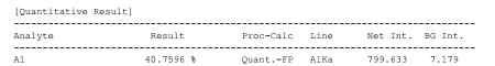 Al的百分含量40.7,校正为Fp法,分析线为吕铝的k阿尔法线,后面为净强度和背景强度