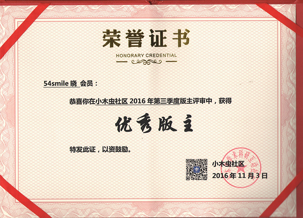 恭喜【54smile晓】获得2016年第3季度优秀版主