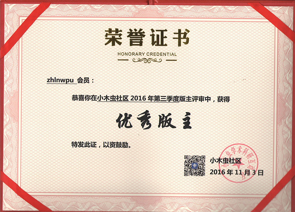 恭喜【zhlnwpu】获得2016年第3季度优秀版主