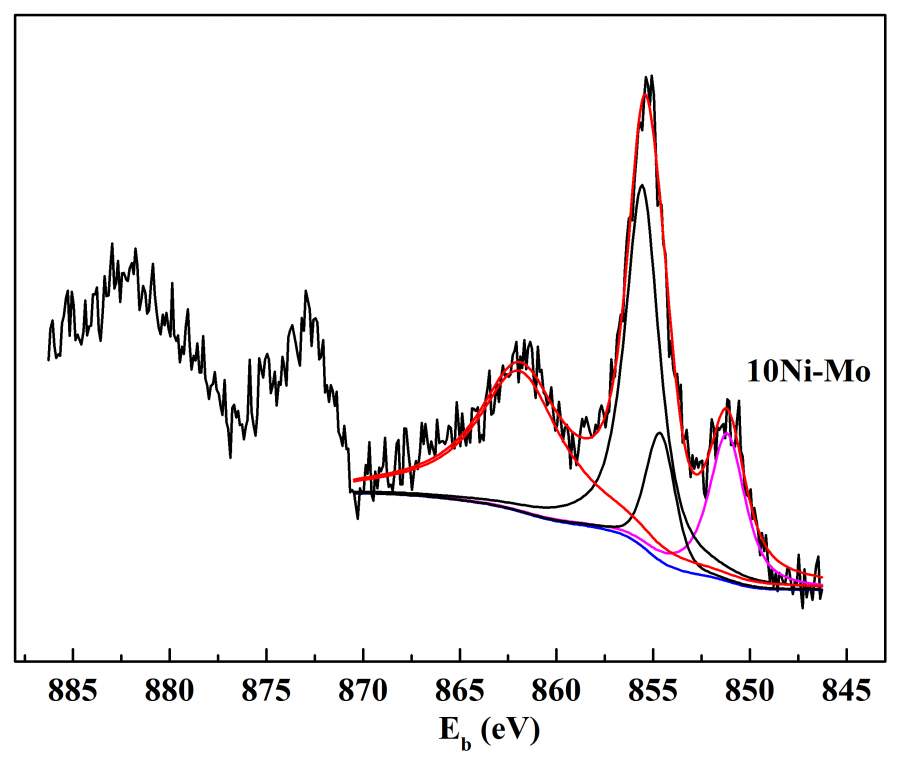 如图,NiMo助剂改性的催化剂XPS谱峰中,854.2eV 归属为NiO,856.2 eV归属为NiAlO4尖晶石,但是851.2eV处的峰归属于什么啊 ?做的一组催化剂都有这个峰 Ni XPS.jpg@lxg133298@zyhou@地狱血幽灵@guozl |