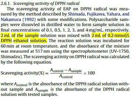 我在测 DPPH的时候,测出来的值是负的。。。使用方法如图,因为是用紫外分光光度计所测,所以加了0.5ml水,以凑够紫外所需体积 发自小木虫Android客户端 |