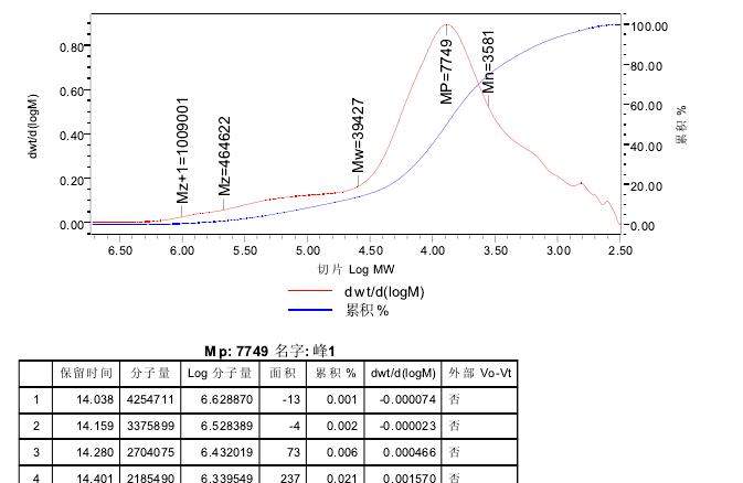 新手第一次做GPC,遇到如下问题: 1.第一个图中上下波动的是溶剂峰吗?溶剂四氢呋喃 2.Mz+1是什么鬼,纵坐标MV又是什么? 3.第二个图是它的分子量分布和积分曲线? 望各位大神不吝赐教 ![]() 121.jpg 212.jpg |