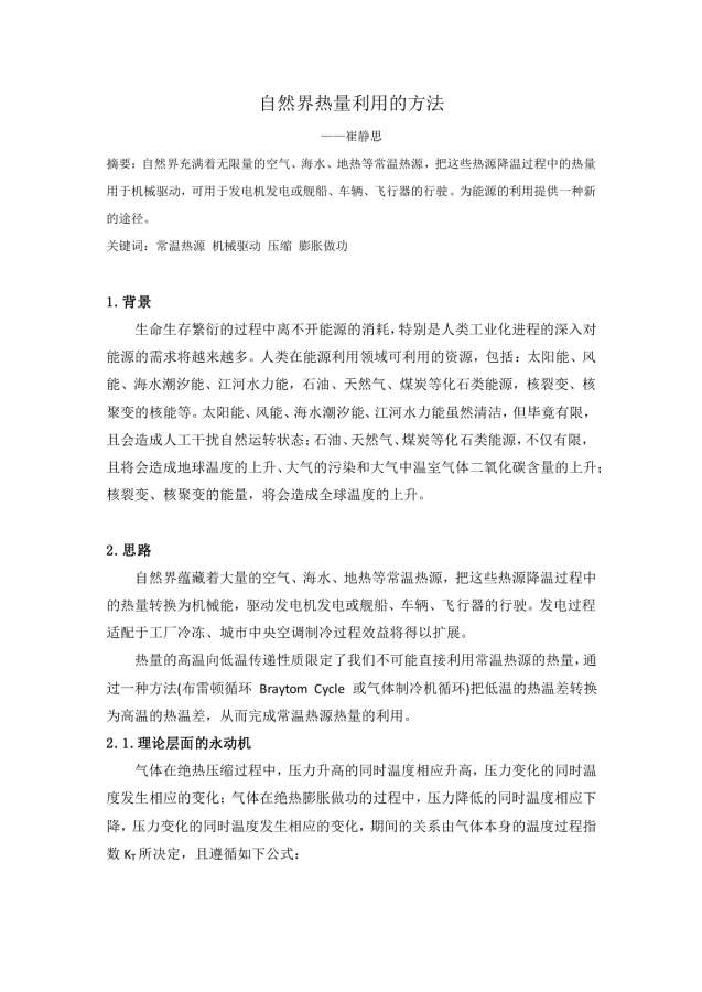 摘要:自然界充满着无限量的空气、海水、地热等常温热源,把这些热源降温过程中的热量用于机械驱动,可用于发电机发电或舰船、车辆、飞行器的行驶。为能源的利用提供一种新的途径。
