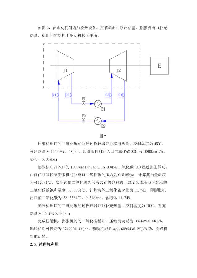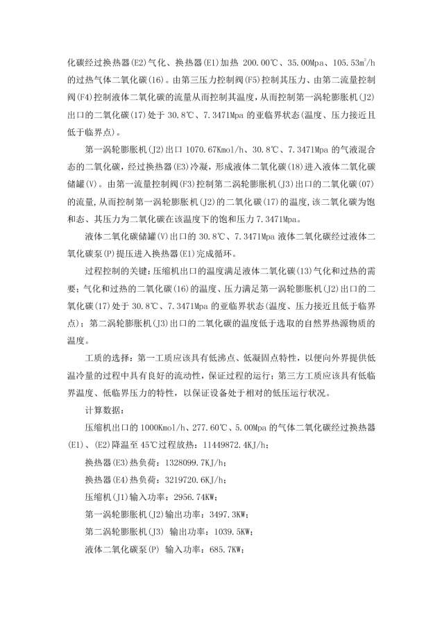 压缩机(J1)出口的1000Kmol/h、277.60℃、5.00Mpa、896.97m3/h的气体二氧化碳经过换热器(E1)、(E2)降温至45℃的热量当量于1070.67 Kmol/h液体二氧化碳由30.8℃的气化和过热为200.00℃、35.00Mpa气体二氧化碳的过程的热量。