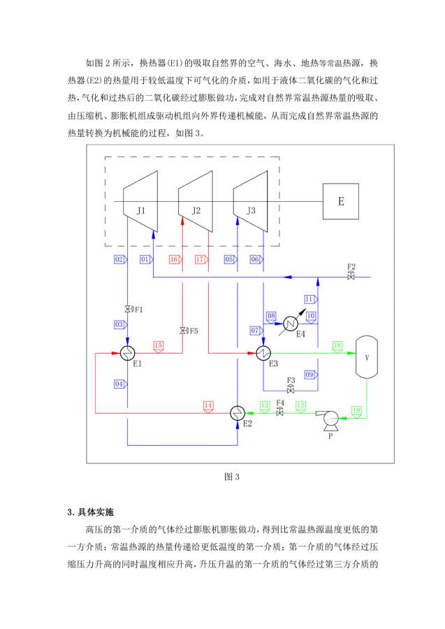 如图2所示,换热器(E1)的吸取自然界的空气、海水、地热等常温热源,换热器(E2)的热量用于较低温度下可气化的介质,如用于液体二氧化碳的气化和过热,气化和过热后的二氧化碳经过膨胀做功,完成对自然界常温热源热量的吸取、由压缩机、膨胀机组成驱动机组向外界传递机械能,从而完成自然界常温热源的热量转换为机械能的过程,如图3。