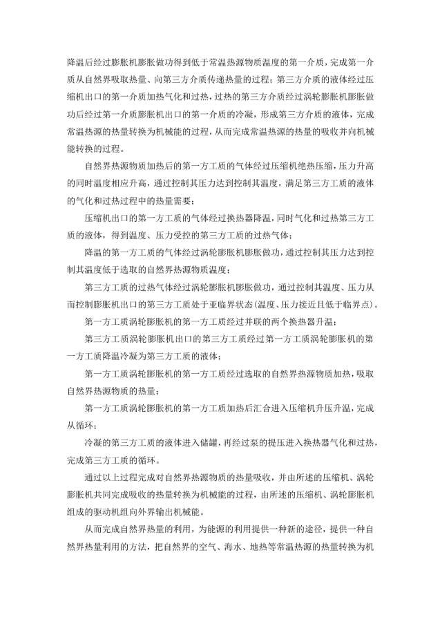 第一方工质涡轮膨胀机的第一方工质经过选取的自然界热源物质加热,吸取自然界热源物质的热量;