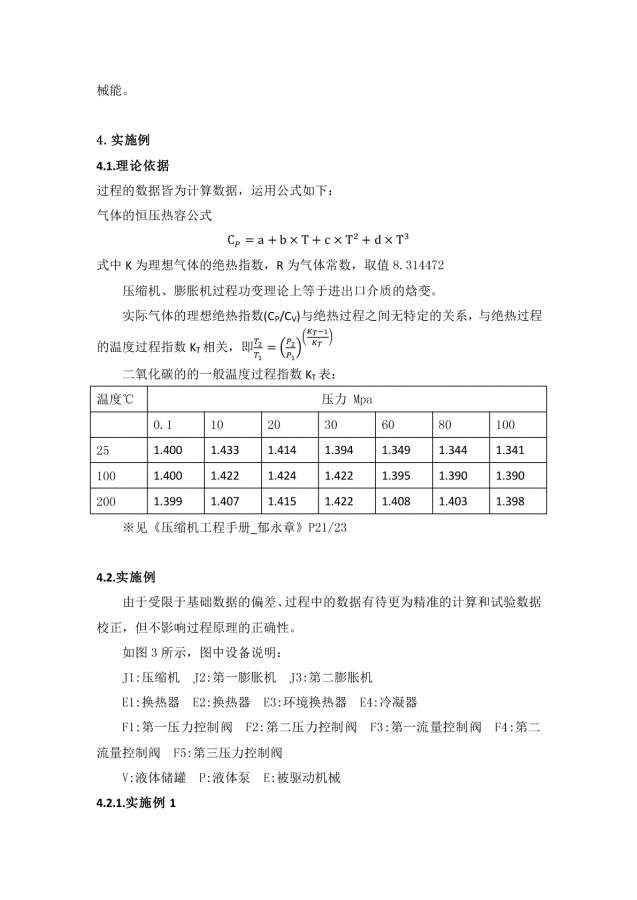 1000Kmol/h、45℃、4.96Mpa、409.38m3/h的气体二氧化碳(05)进入第二涡轮膨胀机(J3)膨胀做功,由第二压力控制阀(F2)的排放或补充控制第二涡轮膨胀机(J3)出口的二氧化碳(06)的压力,从而控制第二涡轮膨胀机(J3)出口的二氧化碳的温度低于选取的自然界热源物质的温度。控制第二涡轮膨胀机(J3)出口的二氧化碳的压力0.538Mpa,计算其当量温度为-112.41℃,该二氧化碳为气体液体共存的饱和状态,实际温度为该压力下的饱和温度-55.6812℃、含液体二氧化碳11.74%。