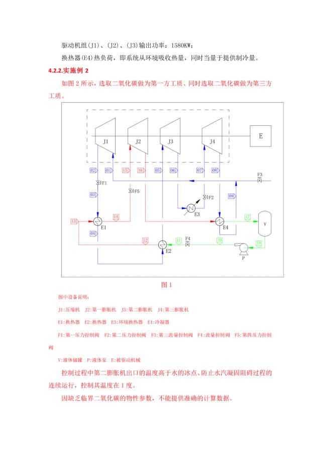 过程控制的关键:压缩机出口的温度满足液体二氧化碳(13)气化和过热的需要;气化和过热的二氧化碳(16)的温度、压力满足第一涡轮膨胀机(J2)出口的二氧化碳(17)处于30.8℃、7.3471Mpa的亚临界状态(温度、压力接近且低于临界点);第二涡轮膨胀机(J3)出口的二氧化碳的温度低于选取的自然界热源物质的温度。