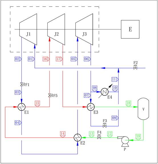 液体二氧化碳泵(P)出口的1070.67 Kmol/h、30.8℃、35.50Mpa的液体二氧化碳经过换热器(E2)气化、换热器(E1)加热200.00℃、35.00Mpa、105.53m3/h的过热气体二氧化碳(16)。由第三压力控制阀(F5)控制其压力、由第二流量控制阀(F4)控制液体二氧化碳的流量从而控制其温度,从而控制第一涡轮膨胀机(J2)出口的二氧化碳(17)处于30.8℃、7.3471Mpa的亚临界状态(温度、压力接近且低于临界点)。