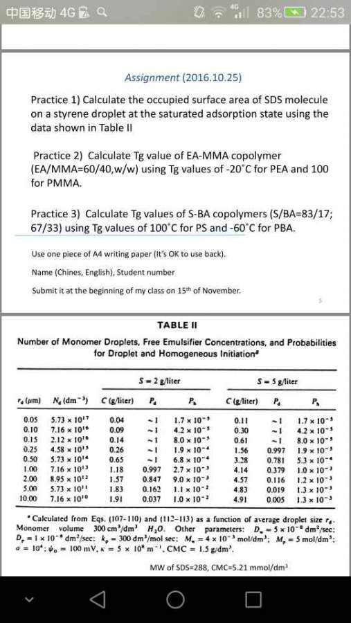 calculate the occupied surface area of SDS molecule on a styrene droplet at the saturated adsorption state using the data inTableⅡ 发自小木虫Android客户端 |
