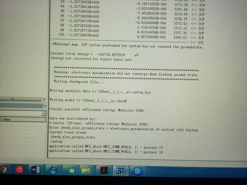 本人想用ms模拟计算氨基酸与CdS纳米链的结合能,现在已做的步骤1:切面CdS(111)取的CdS厚度大概为4层 2:建立4*4*1的超晶胞 3:建立真空层为20 4:用castep优化结构 5:在优化好的硫化镉上画天冬氨酸结构并使氨基酸中的O、N与Cd、S相连接成键(共有10多种连接的情况,并不让氨基酸与CdS紧紧挨着而是不成键的地方远离CdS) 6:固定住下面三层 7:用castep优化(所有参数都未修改,未选Metal) 但是到了这一步经常不收敛,真的不知道是哪里出了问题,跟导师讨论导师说你自己弄我也不会,而且导师说是我的结构有问题,不用修改参数,但是最近看ms的文献发现大多数都修改参数,但是真的不知道该咋修改,或者是前面的步骤有问题?真心跪求各位大神解答!小女子万分感谢!!!感谢各位!!! 发自小木虫IOS客户端 |