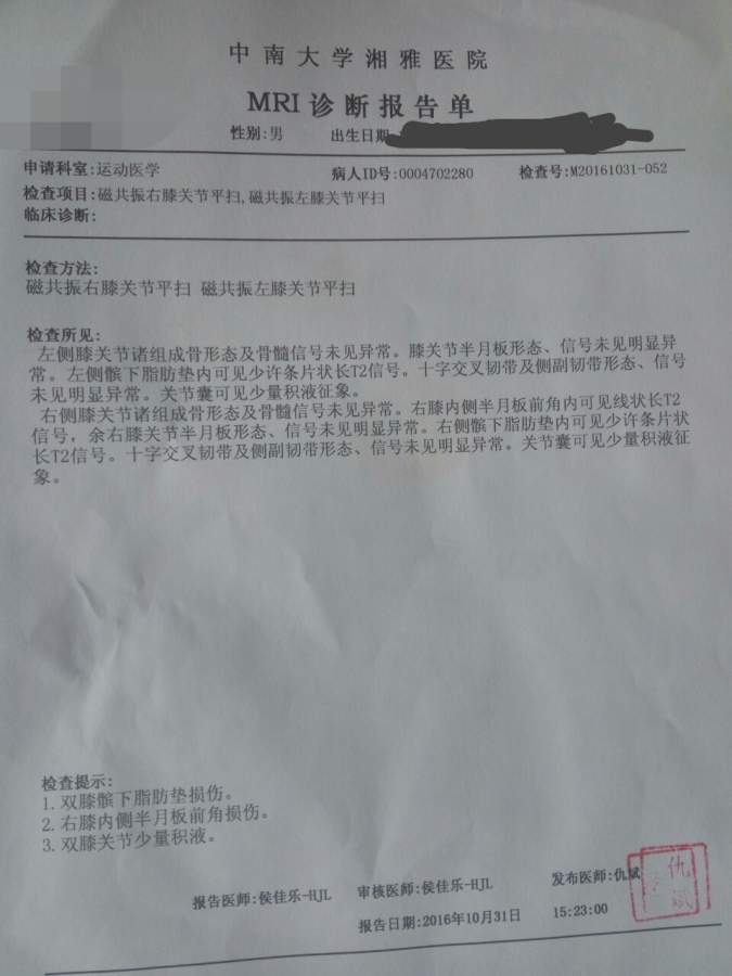膝关节炎,双膝脂肪垫损伤,右膝半月板前角损伤,接近1年了。吃药很多没什么效果,湘雅运动科说药物保守治疗不好最好严重了手术切除!就这样被耗了这么久也不是很痛不算严重,就是时间久了,我查了些论文目前才知道扎针推拿,小针刀效果不错,请问各位我现在采取上面的保守方法治疗可行性咋样?长沙这边做这个的如何![]() MRI报告1_看图王.jpg |