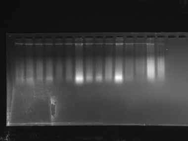 有哪位大神帮我看看我的电泳图?提的DNA,琼脂糖浓度为2%,100v电压跑了36分钟,没有用marker。我想知道这个是不是没提出来,是因为胶制的不好还是压根就没提出DNA。 @xiaoamuchong 发自小木虫Android客户端 |