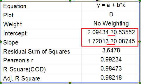 Origin2016 软件作图过程中,线性拟合时,显示的参数如图所示: 请问,为什么中间会有一个“?”号呀?~如何使得参数正常显示?~ Unnamed QQ Screenshot20161107212118.png |