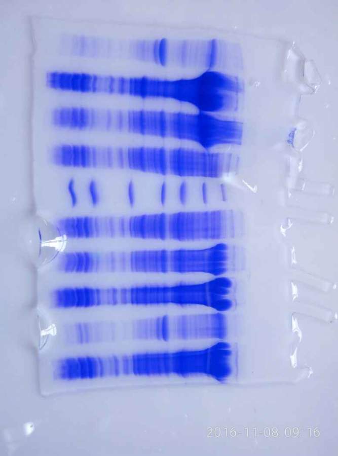 想请问各位虫友,为什么我的蛋白胶跑出来最上面的条带是锯齿壮的呢? 发自小木虫Android客户端 |