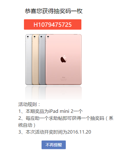本期活动开奖规则: 以2016.11.28日,上证指数开盘指数倒序排列为基数(末尾为0时倒序后补0),与抽奖码后六位进行对比,相同者即为中奖 如有多个相同者,则取7位进行比较,最小的一位为中奖者; 如无相同,则正向差值最小的即为中奖者。 举例说明: 如2016.11.25日开盘指数为3241.24,倒序后为421423,所有抽奖码的后六位与其对比,相同者即为中奖; 如果有两个中奖码分别为 H1079421423和H1078421423,则H1078421423为中奖者 如果没有相同的,则大于421423且差值最小的一个为中奖者,如比421423大的最小的一个数为421435,则421435为中奖者。 如果开盘指数为3241.20,则倒序为的数值为214230 |