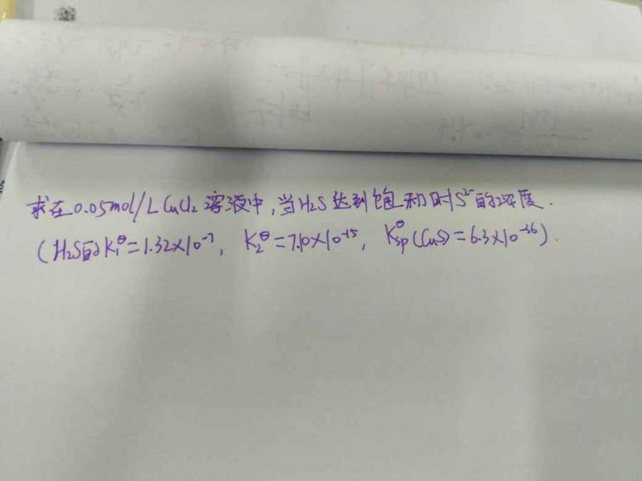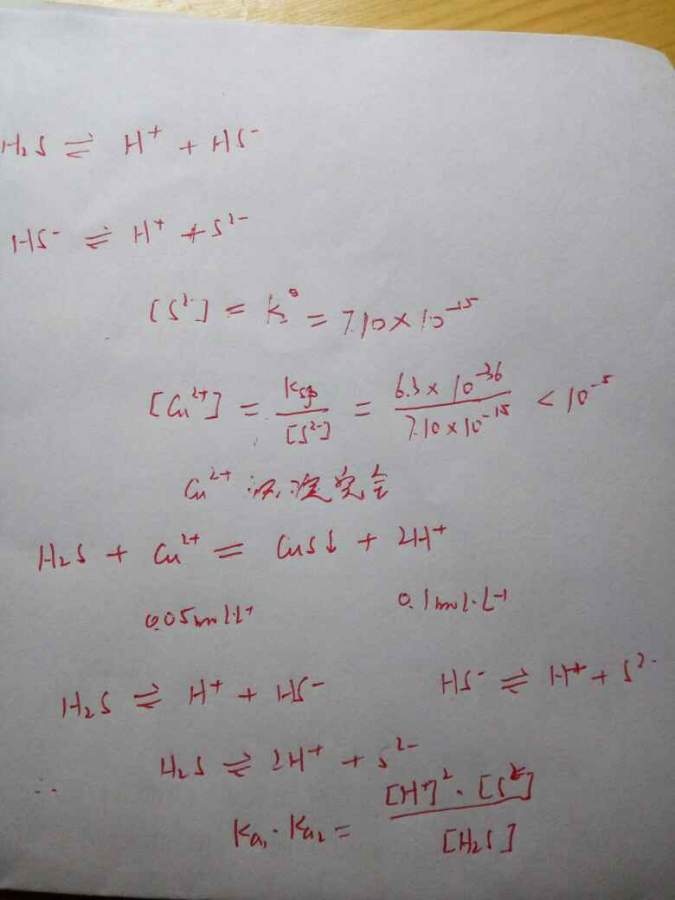 应该是对的,个人认为不需要用溶度积,因为一直通硫化氢至饱和,那么铜离子几乎完全反应则氢离子浓度为0.1,用反应方程的K值就能解出硫离子浓度 发自小木虫Android客户端 |