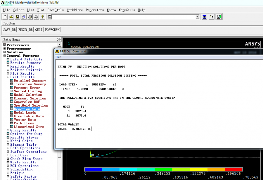 求大神解释!!这个列表结果里面的reaction solution 中的total value 的值0.4839e-06表示什么意思啊,梁的Y方向的总的反力吗还是什么??,上面那个节点1和节点21 的值3073.4是不是表示节点出的反力值啊?怎么差别那么大啊??多谢了 2016-11-13_105359.png 2016-11-13_110051.png |