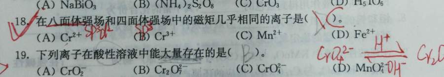 补充说明:我没见过Cr(3+)和Mn(2+)还会存在四面体强场,只见过0价金属时的四面体强场,因此答案选择的是四面体弱场(认为题目可能有点问题)。 如果真有Cr(3+)和Mn(2+)的四面体强场,那答案才是C,Mn(2+)。 选择C的依据应该是:在八面体强场时,Mn(2+)的5个d电子全部填充在T2g轨道上,只有1个成单电子;在四面体强场时,E(低能量的轨道)填充有4个(全部成对),而T轨道上只填充1个,即都有1个成单电子,磁性相近。 |