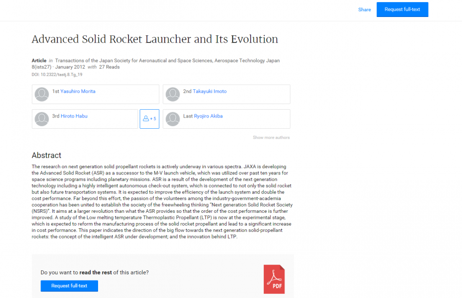 找到了摘要就是下载不了全文,求助。。。 题目: Advanced Solid Rocket Launcher and Its Evolution 来源: Transactions of the Japan Society for Aeronautical and Space Sciences, Aerospace Technology Japan 8(ists27) · January 2012 DOI: 10.2322/tastj.8.Tg_19 |
