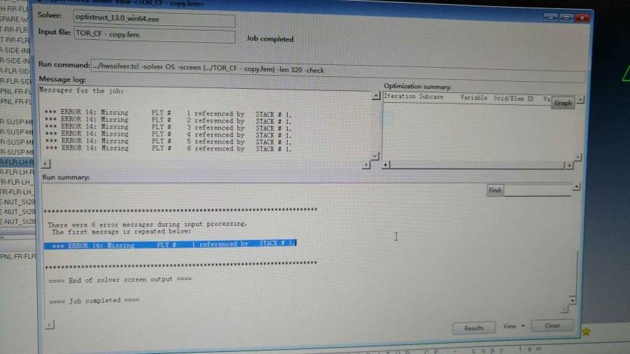 请问这是怎么回事,我想把以前的金属材料换成复合材料,只是在原来的基础上将某个部件的属性和材料换成了复合材料,其他的没变,求解时出现了下图错误提示。。。用的是hypermesh optistruct求解 发自小木虫Android客户端 |