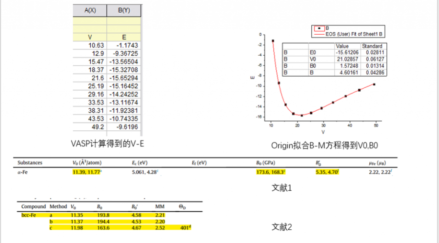 根据侯博士说明对Fe-bcc进行晶格常数优化,得到一系列的V-E值,通过B-M曲线拟合得到平衡体积,体积弹性模量及其导数。但是得到的平衡体积和体积弹性模量与文献值相差较大,不知道错误出在哪里了? 以下附上VASP计算得到的V-M值,origin拟合得到的B-M曲线,以及两篇文献中的平衡体积和体积弹性系数(黄色)。 先谢谢大家了,请多多指点!不胜感激! 图片1.png |