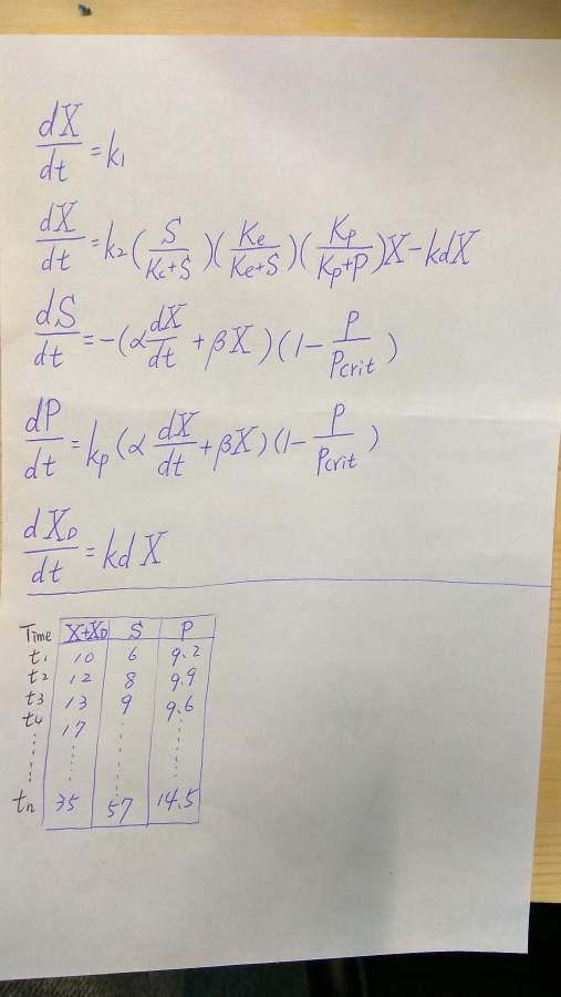 附件显示常微分方程之表示式及已知的实验数据 目前正在争取使用高斯牛顿评估常微分方程组的参数,此法需要得知X与XD经时性的数据, 因实验数据只有(X+XD)的数值,并无法个别得知X和XD的数值,因此是否应该将常微分方程式合并,跪求建议。感激。 IMG_20161118_124948_HDR.jpg |